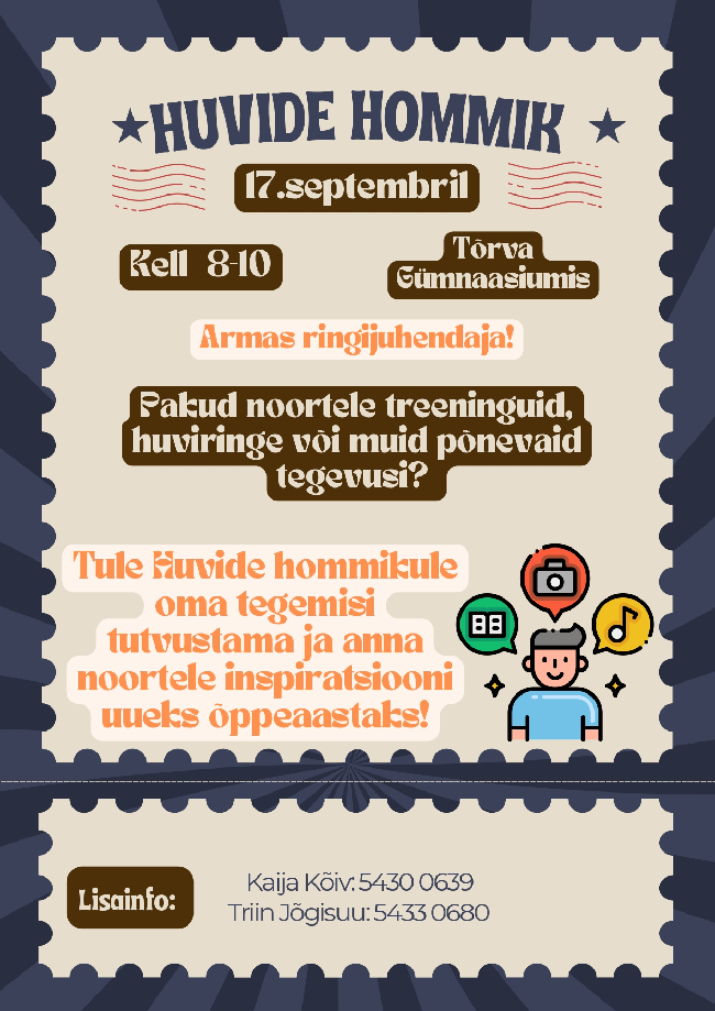 Ootame kõiki Tõrva vallas tegutsevaid huviringe ja huvikoole osalema Huvide hommikul, mis toimub kolmapäeval, 17. septembril kell 8.00–10.00 Tõrva Gümnaasiumis.