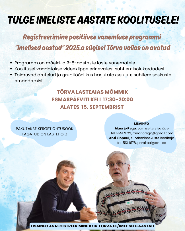 Registreerimine positiivse vanemluse programmi "Imelised aastad" 2025.a sügisel Tõrva vallas on avatud.