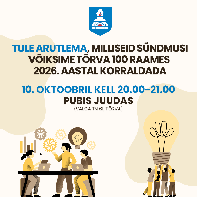 Kutsume sind esimesele avalikule koosolekule 10. oktoobril kell 20.00–21.00 pubisse Juudas. Koos arutleme, milliseid sündmusi võiksime Tõrva 100 raames 2026. aastal korraldada. Kõik ideed on väga oodatud!