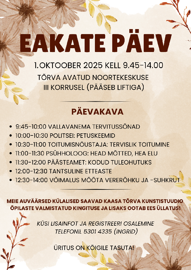 1. oktoobril kell 9.45-14.00 toimub eakate päev Tõrva Avatud Noortekeskuse kolmandal korrusel (Spordi 1, Tõrva). Kolmandale korrusele pääseb liftiga. See on suurepärane võimalus veeta päev täis kasulikke tegevusi ja mõnusat meelelahutust!