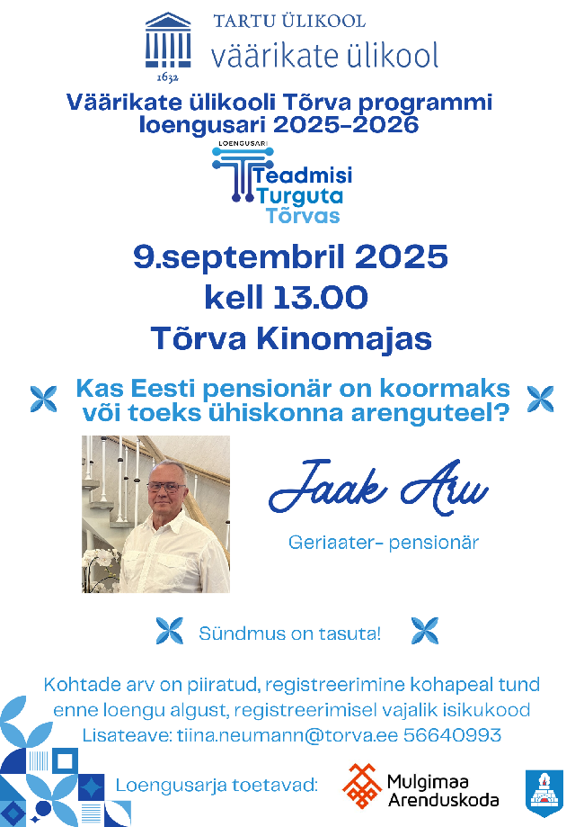 Tõrva Tartu Ülikooli väärikate ülikooli programm "Teadmisi Turguta Tõrvas" alustab loengusarja homme, 9. septembril kell 13.00 Tõrva kinomajas - lektoriks geriaater Jaak Aru ja loengu teemaks „Kas Eesti pensionär on koormaks või toeks ühiskonna arenguteel?