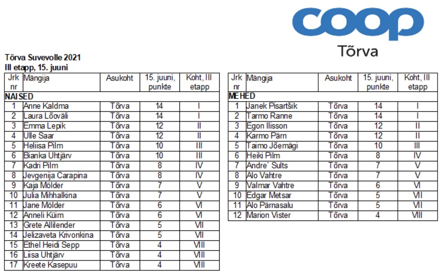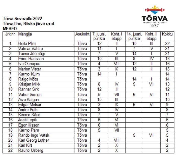 21.09 Tõrva valla sportmängude V osavõistlus - tulemused, üldtabel
