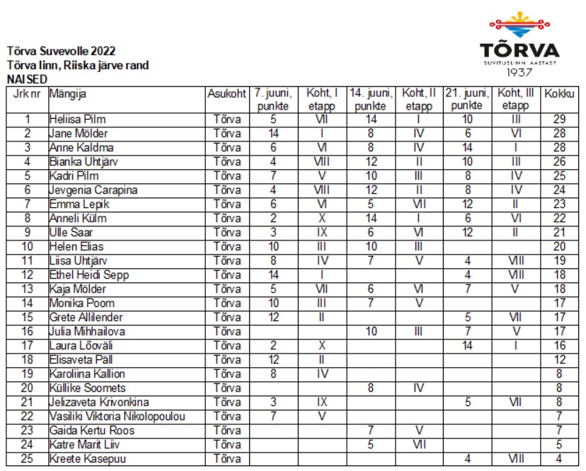 Tõrva kergejõustikuseriaali kokkuvõtlik tabel