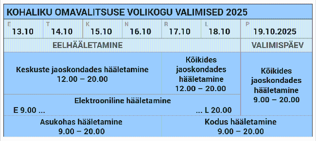 Tänasest nädala lõpuni saab anda oma hääle kohaliku omavalitsuse volikogu valimistel. 13. kuni 18. oktoobrini toimub eel- ja elektrooniline hääletamine. Valimispäeval, 19. oktoobril toimub hääletamine ainult jaoskondades.